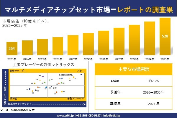 SDKI Analytics(本社:東京都渋谷区)は、このたび、2026年02月27に「マルチメディアチップセット市場調査レポート:2026-2035年の市場規模、シェア、傾向の予測」を発表しました。マルチメディアチップセットに関する市場調査レポートには、統計的および分析的アプローチを使用した予測評価が含まれています。この調査レポートでは、一次および二次調査方法を使用して分析された主要な業界洞察を通じて将来の傾向を理解できるようにすることで、主要な市場動向を読者に説明しています。