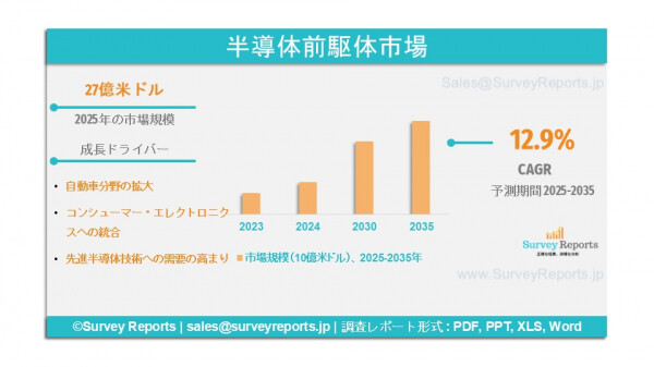 Survey Reports LLCは、2026年3月に、半導体前駆体市場のセグメンテーション:前駆体の種類(有機金属前駆体、無機前駆体)、用途(集積回路(IC)、オプトエレクトロニクス)、製造プロセス(CVD(化学気相成長)、ALD(原子層堆積))、最終用途産業(民生用電子機器、自動車)、前駆体の純度レベル(高純度前駆体、超高純度前駆体)別 - 世界市場の分析、動向、機会、予測(2025年~2035年) に関する調査報告書を発表した。本報告書は、半導体前駆体市場に関する予測評価を提供しており、同市場における成長要因、市場機会、課題、および脅威といった複数の重要な市場力学を明らかにしている。