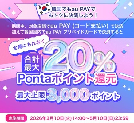 詳細はキャンペーンページ(https://aupay.auone.jp/contents/lp/outbound/koreacp.html)をご確認ください。