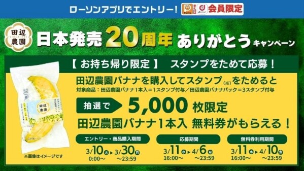 ANAフーズ株式会社(本社:東京都港区、代表取締役社長:田中久敬)は、南米エクアドルから独占輸入販売している「田辺農園バナナ」の日本発売20周年を記念し、お客様への感謝の気持ちを込めて「田辺農園バナナ日本発売20周年ありがとうキャンペーン」の第二弾を2026年3月10日(火)から2026年3月30日(月)まで実施いたします。第二弾は、ローソンにて、Ponta会員、dポイントカード会員限定で、田辺農園バナナ1本無料券(5,000枚)が抽選で当たるキャンペーンを開催します。