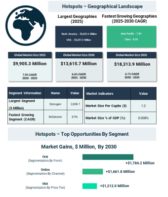 ホルモンサプリメント市場では、いくつかのセグメントが大きな成長機会を示している。メラトニンサプリメントは2030年までに世界の年間売上で10億980万ドルの追加収益を生み出すと予測されている。経口サプリメント形態は17億8,420万ドルの新規売上増加が見込まれている。