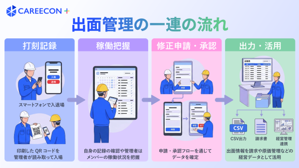 出面管理は、建設現場における入退場の記録から集計・出力までの一連の流れを管理できる機能です。