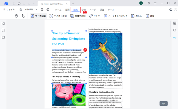 ・PDF編集:PDF内のテキストや画像を直接編集でき、レイアウトや内容を簡単に調整できます。