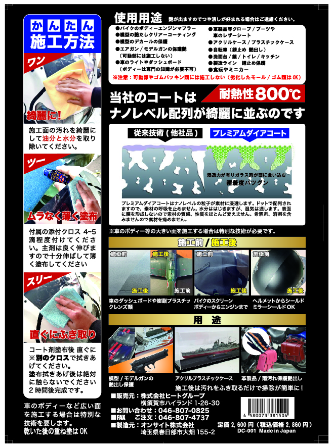 株式会社ヒートグループ(本社:神奈川県横須賀市ハイランド1-26-30 代表取締役:高橋 学)は、無溶剤・オイルレスを採用し、施工面への優しさと圧倒的な耐久性を両立した多目的ガラスコーティング剤「プレミアムダイアコートプロ」を展開しております。
