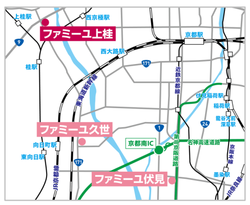 (地図)京都市内のファミーユホールは3店舗の展開となる