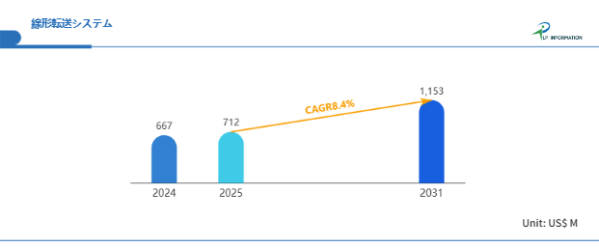 LP Informationの最新レポート「世界線形転送システム市場の成長予測2026~2032」(https://www.lpinformation.jp/reports/574678/linear-transfer-systems)によると、グローバル線形転送システム市場は2025年から2031年までCAGR8.4%で成長し、2031年には11.53億米ドル規模に達すると予測されている。DX投資の本格化、設備更新需要、そして各国政府による製造業回帰政策が追い風となり、市場拡大の余地は依然として大きい。特にアジア太平洋では電子製造の集積が継続、欧州では高付加価値製造へのシフトが鮮明である。単なる搬送装置ではなく、設備間連携と制御最適化を担う「インテリジェント搬送基盤」として価値が再定義されており、設備投資における中心領域としての存在感を着実に高めている。