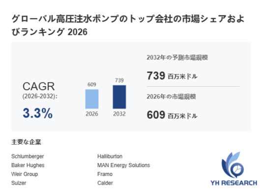 YHResearch調査チームの最新レポート「グローバル高圧注水ポンプのトップ会社の市場シェアおよびランキング 2026」によると、2026年の609百万米ドルから2032年には739百万米ドルに成長し、2026年から2032年の間にCAGRは3.3%になると予測されています。
