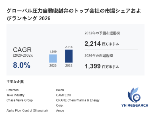 YHResearch調査チームの最新レポート「グローバル圧力自動密封弁のトップ会社の市場シェアおよびランキング 2026」によると、2026年の1399百万米ドルから2032年には2214百万米ドルに成長し、2026年から2032年の間にCAGRは8.0%になると予測されています。