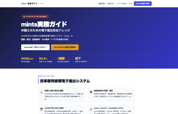 AIリーガルOS「AILEX」を開発・提供するAILEX合同会社(東京都渋谷区、顧問弁護士事務所: 弁護士法人えそら)は、民事裁判書類電子提出システム「mints」の実務情報を体系的に解説する弁護士向け無料ナレッジベース「mints実務ガイド」を2026年3月11日に公開しました。