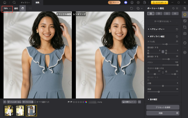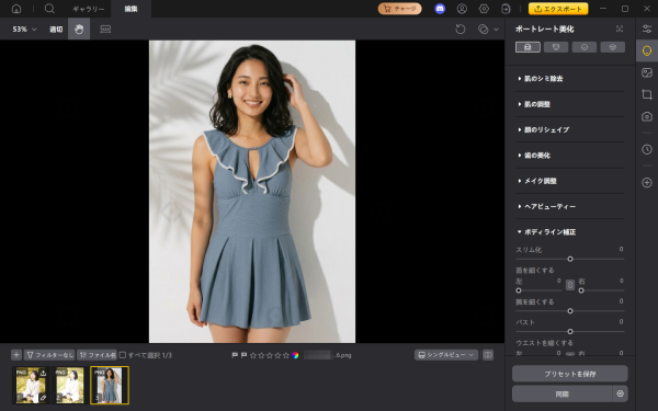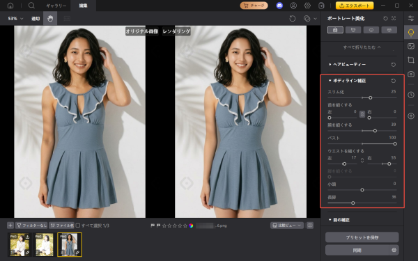 手順2:体型補正ツールでスライダーを少しずつ動かし、全体のシルエットを自然に整えます。