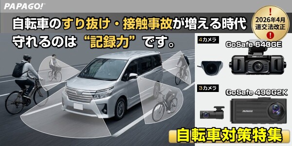 2026年4月の道路交通法改正により、自転車の交通違反に対して反則金制度(青切符)が導入されます。これに伴い、自転車の車道走行が増加し、すり抜け接触や停車中の側面接触、信号待ちでの追突など、車両周囲で発生する自転車との接触リスクが高まることが懸念されています。こうした状況を受け、PAPAGO JAPAN株式会社は、自転車事故対策に特化したドライブレコーダー特集ページを公開しました。