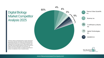 デジタル生物学市場には、バイオテクノロジー企業、デジタルプラットフォーム企業、生命科学技術企業など多様な企業が参加している。市場は比較的分散しており、2024年には上位10社が約20.5%の市場シェアを占めた。