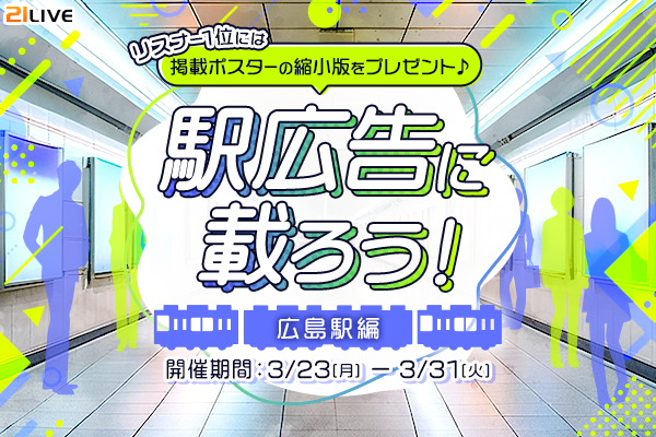 株式会社エムアンドティーティー(本社:沖縄県北谷町、代表取締役:井藤 三知子)が運営するエンターテイメント・ライブ配信アプリ【21LIVE(ニーイチライブ)】URL: https://21.live では、3月23日(月)より『駅広告に載ろう!〜広島駅編〜』を開催します。