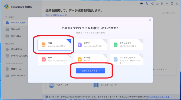 2:復元したいファイルの種類を選択して「スキャン」をクリック。今回は例として「写真」のみを選択します。
