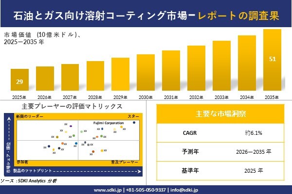 SDKI Analytics(本社:東京都渋谷区)は、このたび、2026年03月09に「石油とガス向け溶射コーティング市場調査レポート:2026-2035年の市場規模、シェア、傾向の予測」を発表しました。石油とガス向け溶射コーティングに関する市場調査レポートには、統計的および分析的アプローチを使用した予測評価が含まれています。この調査レポートでは、一次および二次調査方法を使用して分析された主要な業界洞察を通じて将来の傾向を理解できるようにすることで、主要な市場動向を読者に説明しています。