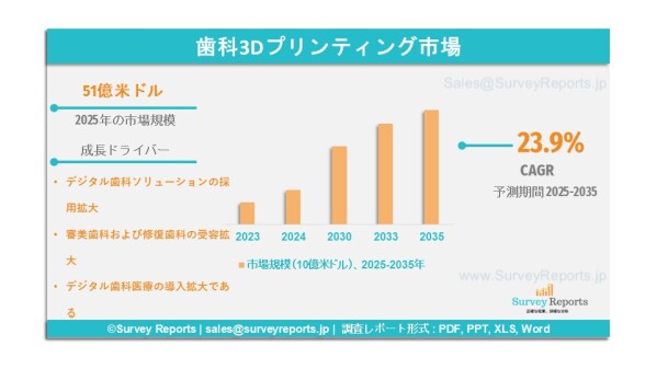 Surveyreportsの専門家は歯科用3Dプリンティング市場に関する調査を分析し、2025年における市場規模が51億米ドルであったことを明らかにした。さらに、歯科用3Dプリンティング市場の売上高は2035年末までに287億米ドルに達すると予測される。同市場は、2025年から2035年の予測期間において、約23.9%の年平均成長率(CAGR)で成長すると見込まれる。