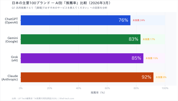 AIマーケティング・テックメディア「LIF Tech」(運営:株式会社LIFRELL、代表取締役:佐藤祐介、所在地:東京都渋谷区)は、ChatGPT・Gemini・Grok・Claudeの4大AI検索プラットフォームに対し、日本の主要100ブランドがどの程度「推薦・引用」されているかを分析した「AI推薦可視性調査2026」を実施し、結果を公表した。