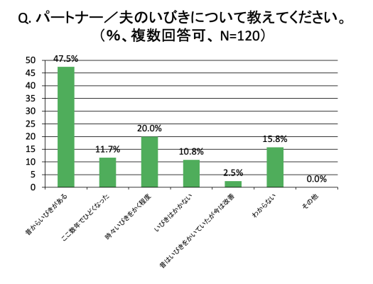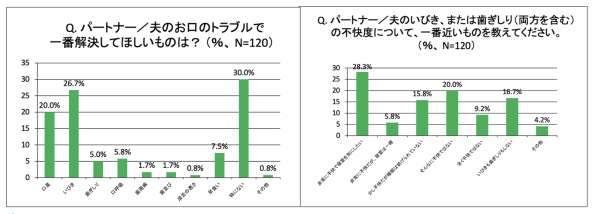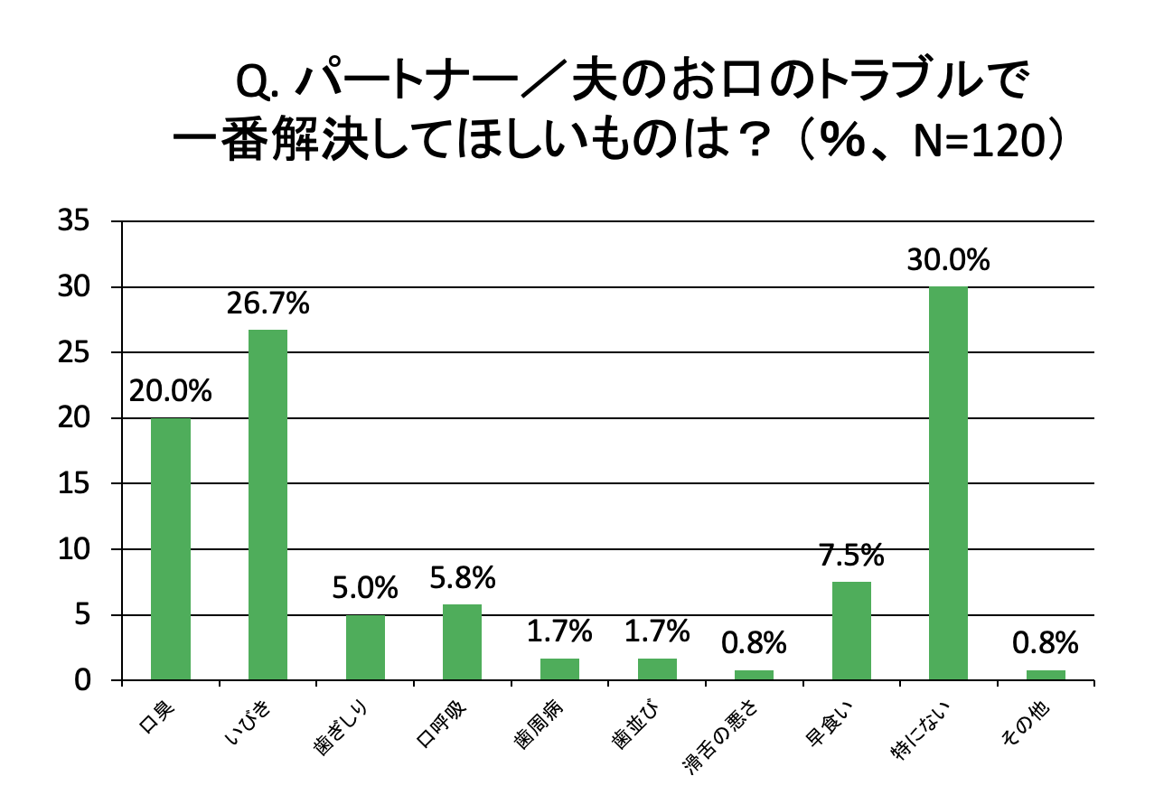 「あなたのパートナー/夫のお口のトラブルで一番解決してほしいものは?」の問いに、一番多かったのは「いびき」で26.7%でした。次点の「口臭」よりも6.7ポイント多い結果になりました。