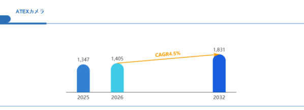 Global reports調査チームの最新レポート「グローバルATEXカメラ市場規模、主要企業シェア、ランキング分析レポート【2026年版】」によると、グローバルATEXカメラ市場は2025年の1347百万米ドルから2032年には1831百万米ドルに成長し、2026年の市場規模は約1405百万米ドルと推計されており、2026-2032年のCAGR(年間成長率)が4.5%に達すると予測されている。