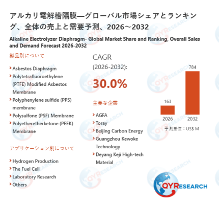 QY Research株式会社(東京都中央区)は、「アルカリ電解槽隔膜―グローバル市場シェアとランキング、全体の売上と需要予測、2026~2032」の最新レポートを発表しました。