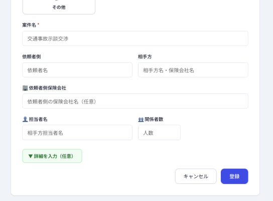 ・事件登録フォーム — カテゴリで「交通事故示談交渉」「損害賠償請求事件」等を選択した際に、入力欄が自動表示されます。相手方名・保険会社名に加えて、依頼者側保険会社を任意で登録できます。