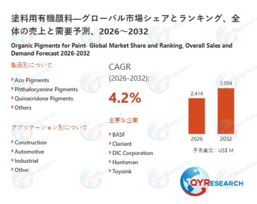 QY Research株式会社(所在地:東京都中央区)は、「塗料用有機顔料―グローバル市場シェアとランキング、全体の売上と需要予測、2026~2032」に関する最新調査レポートを公開しました。本レポートでは、塗料用有機顔料の世界市場を対象に、市場規模、販売数量、価格推移、市場シェア、主要企業の競争ポジションを体系的に整理し、地域別・国別の動向に加えて、製品タイプ別および用途別の詳細セグメント分析を掲載しています。さらに、2021年から2032年までのデータを基に市場の中長期的な成長軌道を検証し、将来的な拡大余地や投資機会を提示するとともに、競争環境の構造変化や企業戦略の方向性、業界が直面する課題についても多面的に考察しています。