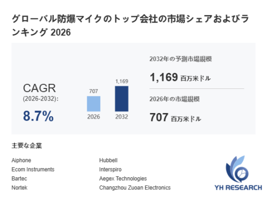 YHResearch調査チームの最新レポート「グローバル防爆マイクのトップ会社の市場シェアおよびランキング 2026」によると、2026年の707百万米ドルから2032年には1169百万米ドルに成長し、2026年から2032年の間にCAGRは8.7%になると予測されています。