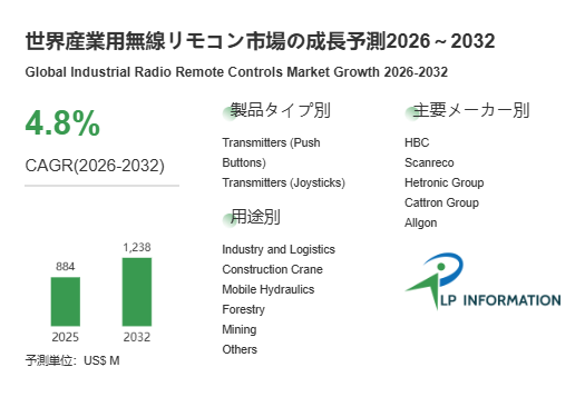 LP Information調査チームの最新レポートである「世界産業用無線リモコン市場の成長予測2026~2032」(https://www.lpinformation.jp/reports/767223/industrial-radio-remote-controls)によると、当該市場は2026年から2032年にかけてCAGRが4.8%で推移し、2032年までに市場規模は12.38億米ドルに達すると予測されている。これが示唆する市場像は、爆発的拡大ではなく、設備投資と保守更新が折り重なる“継続成長型”である点にある。