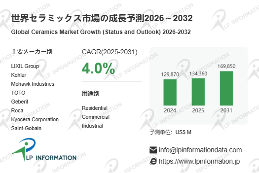 LP Information調査チームの最新レポートである「世界セラミックス市場の成長予測2026~2032」(https://www.lpinformation.jp/reports/590022/ceramics)によると、2026年から2032年の予測期間中のCAGRが4.0%で、2032年までにグローバルセラミックス市場規模は1698.5億米ドルに達すると予測されている。すなわち本産業は「縮む局面で体力差が露呈し、戻る局面で構造優位が収益化される」典型例となる。需要面では住宅・商業建築の投資サイクルが短期の波を作り、供給面ではエネルギーコスト、原料調達、物流、そして環境負荷低減要請が、製造コストと価格形成の規律を強める。結果として、単なる量産力だけでは超過利潤を獲得しにくく、意匠性、ブランド、施工・流通支配、さらには機能材料としての差別化が、世界同時に問われる局面へ移行している。市場が再び増勢に転じる局面では、価格競争の疲弊を経験した企業ほど、付加価値設計と供給安定性を武器に、収益の質を引き上げやすい。