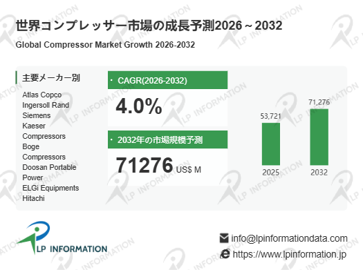 LP Information調査チームの最新レポートである「世界コンプレッサー市場の成長予測2026~2032」(https://www.lpinformation.jp/reports/577044/compressor)によると、2026年から2032年の予測期間中のCAGRが4.0%で、2032年までにグローバルコンプレッサー市場規模は712.76億米ドルに達すると予測されている。この二段階のカーブは、景気循環よりも構造転換の影響を強く示唆する。第一に、冷凍・空調では高効率化と冷媒転換が同時進行し、インバータ駆動や制御最適化が競争軸となる。第二に、産業向けでは省エネ投資と保全DXが普及し、センサーと遠隔監視、予兆保全、エネルギー管理が機器販売の付加価値を押し上げる。第三に、脱炭素の文脈で水素、CCUS、バイオガスなどガスインフラ投資が立ち上がり、高圧・高信頼の領域で技術と実績が収益力を左右する。需要の中心は単なる数量増ではなく、規制対応とライフサイクルコストの最適化により、更新需要が高付加価値化していく構図である。