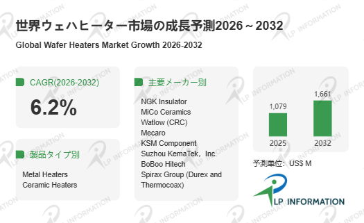 LP Information調査チームの最新レポートである「世界ウェハヒーター市場の成長予測2026~2032」(https://www.lpinformation.jp/reports/638149/wafer-heaters)によると、グローバルウェハヒーター市場は2026年から2032年にかけて年平均6.2%の堅調な成長を続け、2032年には16.61億米ドルに達する見通しである。特徴的なのは、単なる数量拡大ではなく、プロセス高度化に伴う機能価値の向上が市場拡大を牽引している点である。高精度温度制御、高熱伝導性、低パーティクル発生といった要件が、従来の金属系からセラミック系への移行を促し、単価上昇と収益構造の改善をもたらしている。とりわけ、AI・高性能計算(HPC)やパワー半導体など、熱プロセス負荷の高い分野で採用が増加し、市場全体が「性能主導型」へとシフトしていることが特徴である。