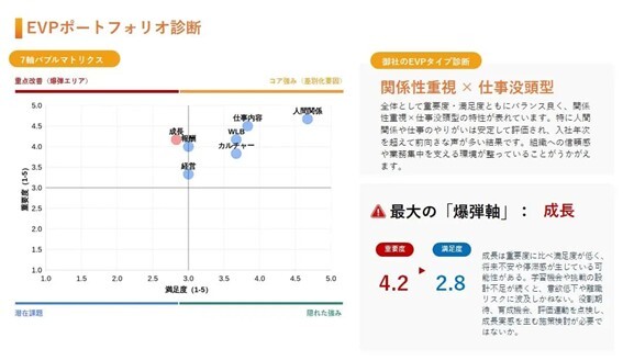 診断結果はグラフやマップ形式で可視化され、採用・組織課題を直感的に理解できるアウトプットとして提供します。
