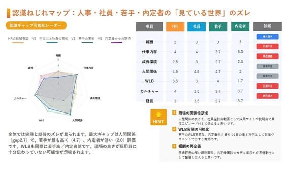 本サービスは、人事・現場社員・内定者など複数の立場から“働く価値”の認識を収集し、AIとデータ分析によって認識ギャップと組織の本質的な魅力・課題を可視化します。