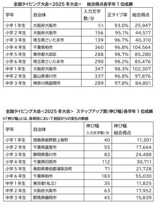 今大会では、総合得点上位入賞者に加えて、前回からの伸び幅が大きい児童生徒を表彰するステップアップ賞も設けました。小学4年生の1位の児童は入力文字数360文字/分、総合得点104,564点を記録し、全体でも1位を獲得。大会開催以来、過去最高文字数・最高得点となりました。