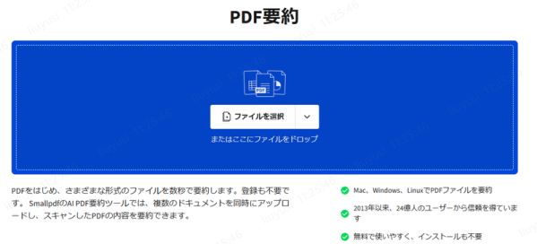 Smallpdfが提供するAI PDF Summarizerは、ブラウザ上で利用できる便利な要約ツールです。AIがPDFの内容を自動で読み取り、長い文章の中から重要なポイントだけを抜き出して、分かりやすく整理します。短時間で内容を把握したいビジネスパーソンや学生にとって、非常に役立つサービスです。