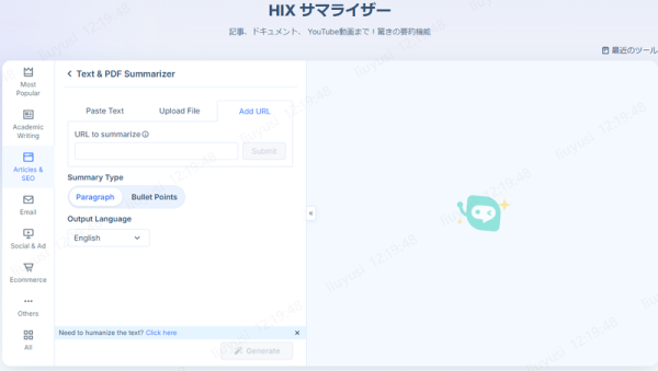 HIX Summarizerは、オンラインで手軽に使えるAI要約ツールで、テキストだけでなくPDFやWebページの内容もスピーディーにまとめることができます。AIが文章の意味を理解し、必要な情報だけを抽出して短く整理してくれるため、長文を効率よく読みたい人に適しています。