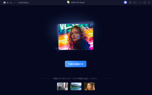 手順1.4DDiG File Repairをインストールし、起動します。プログラムのインターフェイスで、「AI高画質化」タブの「写真高画質化」を選択します。
