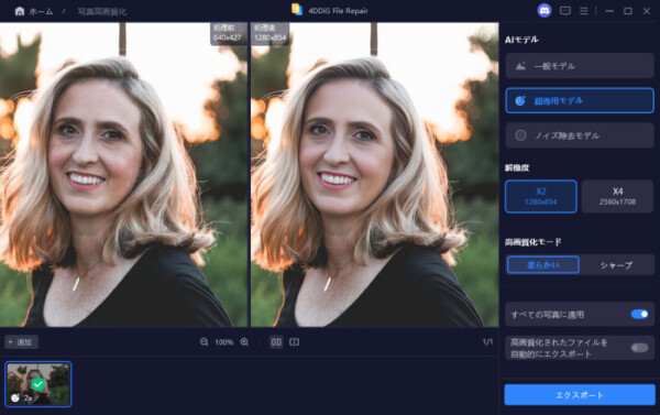 4DDiG File Repairは、画像を高画質化するに必要な機能がすべて揃ったフリーソフトです。AI技術を活用した高画質化機能により、古くてぼやけた写真や画像も鮮明な画質に復元し、まるで新たな命を吹き込んだかのように美しく仕上げます。