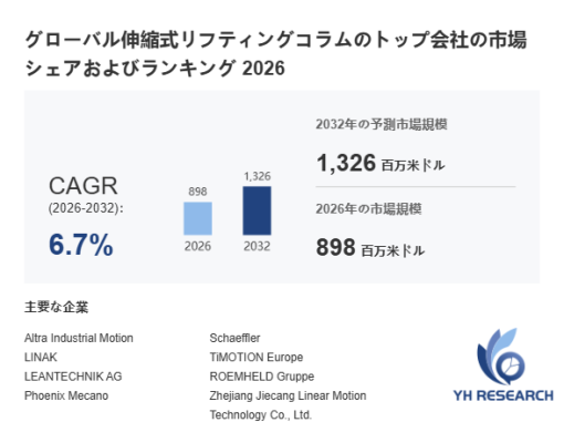 YHResearch調査チームの最新レポート「グローバル伸縮式リフティングコラムのトップ会社の市場シェアおよびランキング 2026」によると、2026年の898百万米ドルから2032年には1326百万米ドルに成長し、2026年から2032年の間にCAGRは6.7%になると予測されています。