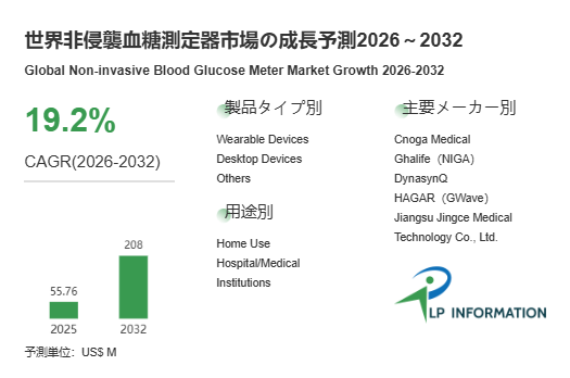 LP Information調査チームの最新レポートである「世界非侵襲血糖測定器市場の成長予測2026~2032」(https://www.lpinformation.jp/reports/743097/non-invasive-blood-glucose-meter)によると、2026年から2032年の予測期間中のCAGRが19.2%で、2032年までにグローバル非侵襲血糖測定器市場規模は2.08億米ドルに達すると予測されている。この市場成長を牽引する主なドライバーとしては、糖尿病および境界型血糖異常の世界的な有病率増加、患者の利便性要求の高まり、ウェアラブルデバイスやAI技術を活用した測定精度向上への期待、在宅医療・遠隔医療の普及が挙げられる。これらの要因は消費者層を従来の患者中心から健康志向層まで広げ、マーケットの拡大を後押ししている。