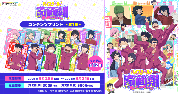 株式会社インクルーズ(東京都渋谷区、代表取締役社長 山﨑 健司)は、3月25日(水)より、日本全国のコンビニエンスストア店内のマルチコピー機を中心に、気軽にプリントできる「インクルーズプリント by eプリントサービス」にて、TVアニメ『ハイスクール!奇面組』のコンテンツプリント第1弾がランダム式で販売開始したことをご報告させていただきます。