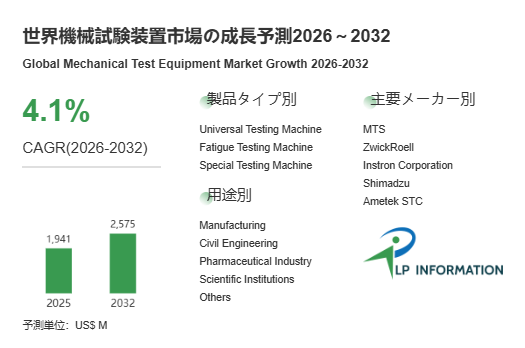 LP Information 調査チームの最新レポート「世界機械試験装置市場の成長予測2026~2032」(https://www.lpinformation.jp/reports/579825/mechanical-test-equipment)によると、2024 年の世界機械試験装置市場規模は 19 億 41 万米ドルであり、2025~2031 年の年平均成長率(CAGR)4.1% で拡大し、2031 年には 25 億 75 万米ドルに達する見込みである。世界の主要地域で工業化とインフラ整備が加速しており、信頼性の高い材料試験ソリューションに対する需要が高まっている。