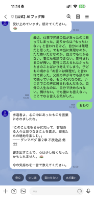 書き出された内容全体をRAG(検索拡張生成)技術で分析し、10,000偈句以上のデータベースから最もふさわしい経典の偈句を一つ選んでお届けします。偈句には経典名・章・偈番号が明示されます。