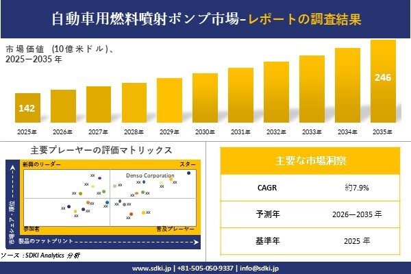 SDKI Analytics(本社:東京都渋谷区)は、このたび、2026年03月17に「自動車用燃料噴射ポンプ市場調査レポート:2026-2035年の市場規模、シェア、傾向の予測」を発表しました。自動車用燃料噴射ポンプに関する市場調査レポートには、統計的および分析的アプローチを使用した予測評価が含まれています。この調査レポートでは、一次および二次調査方法を使用して分析された主要な業界洞察を通じて将来の傾向を理解できるようにすることで、主要な市場動向を読者に説明しています。