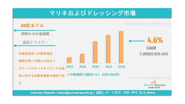 Survey Reports LLCは、2026年3月に「マリネおよびドレッシング市場:タイプ別(酸性マリネ、乳製品マリネ、酵素マリネ)、用途別(食肉・家禽、シーフード、野菜、サラダ)、流通チャネル別(スーパーマーケット/ハイパーマーケット、コンビニエンスストア、オンライン小売、フードサービス)、エンドユーザー別(家庭、フードサービス業界、レストラン、食品加工業者)―世界市場分析、動向、機会および予測(2025年~2035年)」と題する調査レポートを発行したと発表した。本レポートはマリネおよびドレッシング市場の予測評価を提供するものであり、成長要因、市場機会、課題、および脅威を含む複数の主要な市場ダイナミクスを強調しているものである。