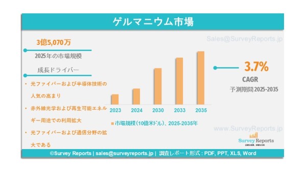 Survey Reports LLCは、2026年3月に「ゲルマニウム市場:用途別(電子機器、光学、太陽電池、赤外線システム、その他用途)、製品タイプ別(多結晶ゲルマニウム、単結晶ゲルマニウム、ゲルマニウム化合物)、最終用途産業別(通信、自動車、家電、軍事・防衛、その他産業)―世界市場分析、動向、機会および予測(2025年~2035年)」と題する調査レポートを発行したと発表した。本レポートはゲルマニウム市場の予測評価を提供するものであり、成長要因、市場機会、課題、および脅威を含む複数の主要な市場ダイナミクスを強調しているものである。