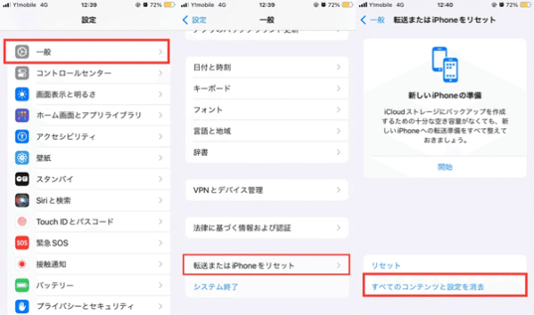 4.「すべてのコンテンツと設定を消却」を選んで初期化を行ないます。