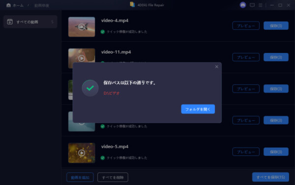 手順4:修復した動画に問題がない場合、各動画の「保存」ボタンをクリックするか、「すべてを保存」を選択して、修復済みの動画を一度にパソコンに保存できます。
