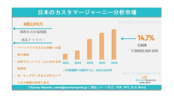 Survey Reports LLCは、2026年3月に日本カスタマージャーニー分析市場に関する調査報告書を発表したと公表した。本報告書は、コンポーネント別(ソリューション、サービス)、タッチポイント別(ウェブ、ソーシャルメディア、モバイル、電子メール、支店および店舗、コールセンター、その他)、導入形態別(オンプレミス、クラウドベース)、組織規模別(大企業、中小企業)、用途別(顧客セグメンテーションおよびターゲティング、顧客行動分析、顧客離反分析、ブランド管理、キャンペーン管理、製品管理、その他)、業種別(BFSI、ITおよび通信、小売および電子商取引、医療、メディアおよびエンターテインメント、旅行およびホスピタリティ、その他)に市場を分類し、市場分析、動向、機会、および2025年から2035年までの予測を提示するものであり、日本カスタマージャーニー分析市場の予測評価を提供する。また、本報告書は、成長要因、市場機会、課題、脅威を含む主要な市場ダイナミクスを強調している。