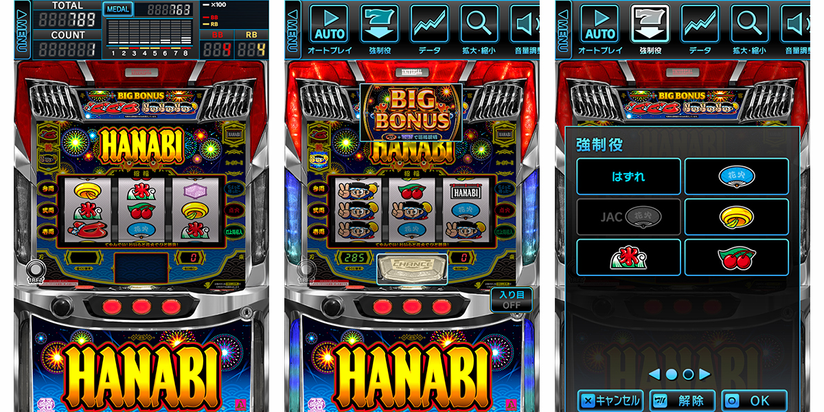 小役・ボーナスなどのフラグ設定ができる強制役や時短の高速オートモードなど、シミュレーターアプリならではの